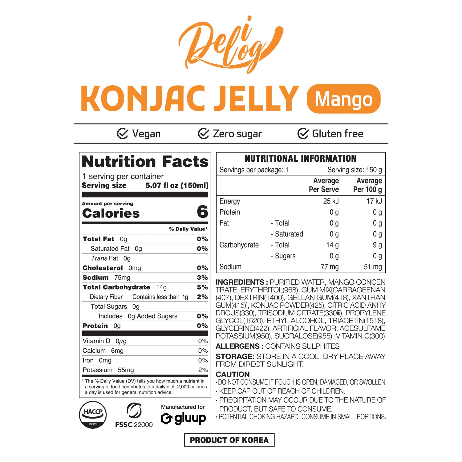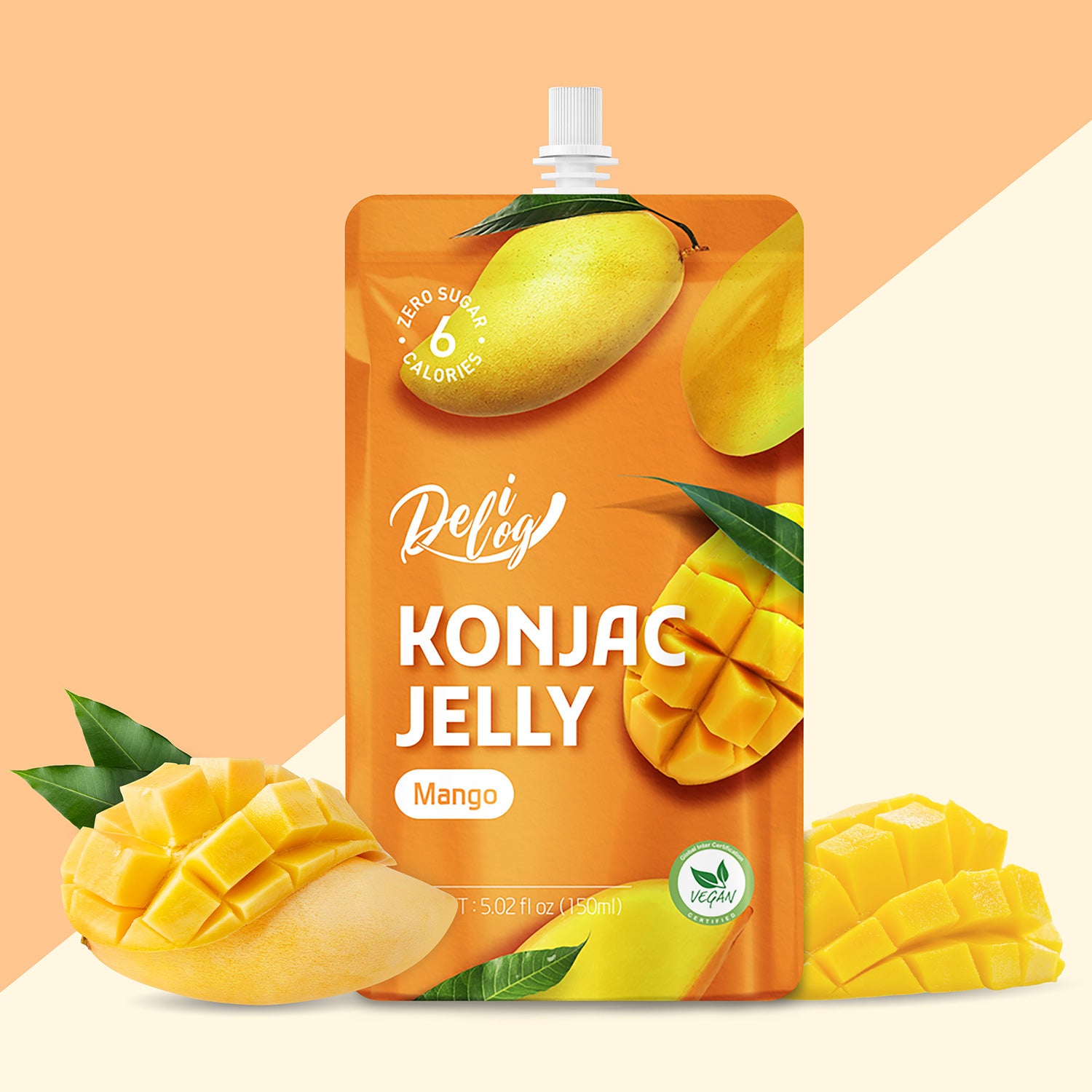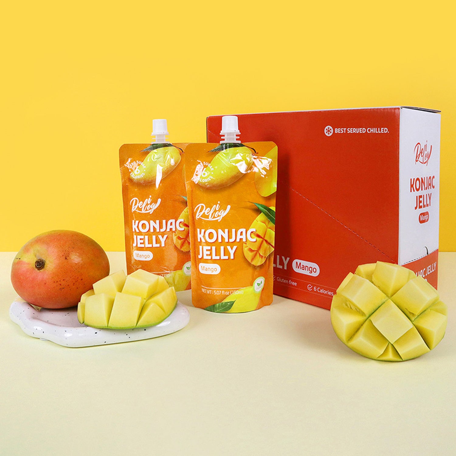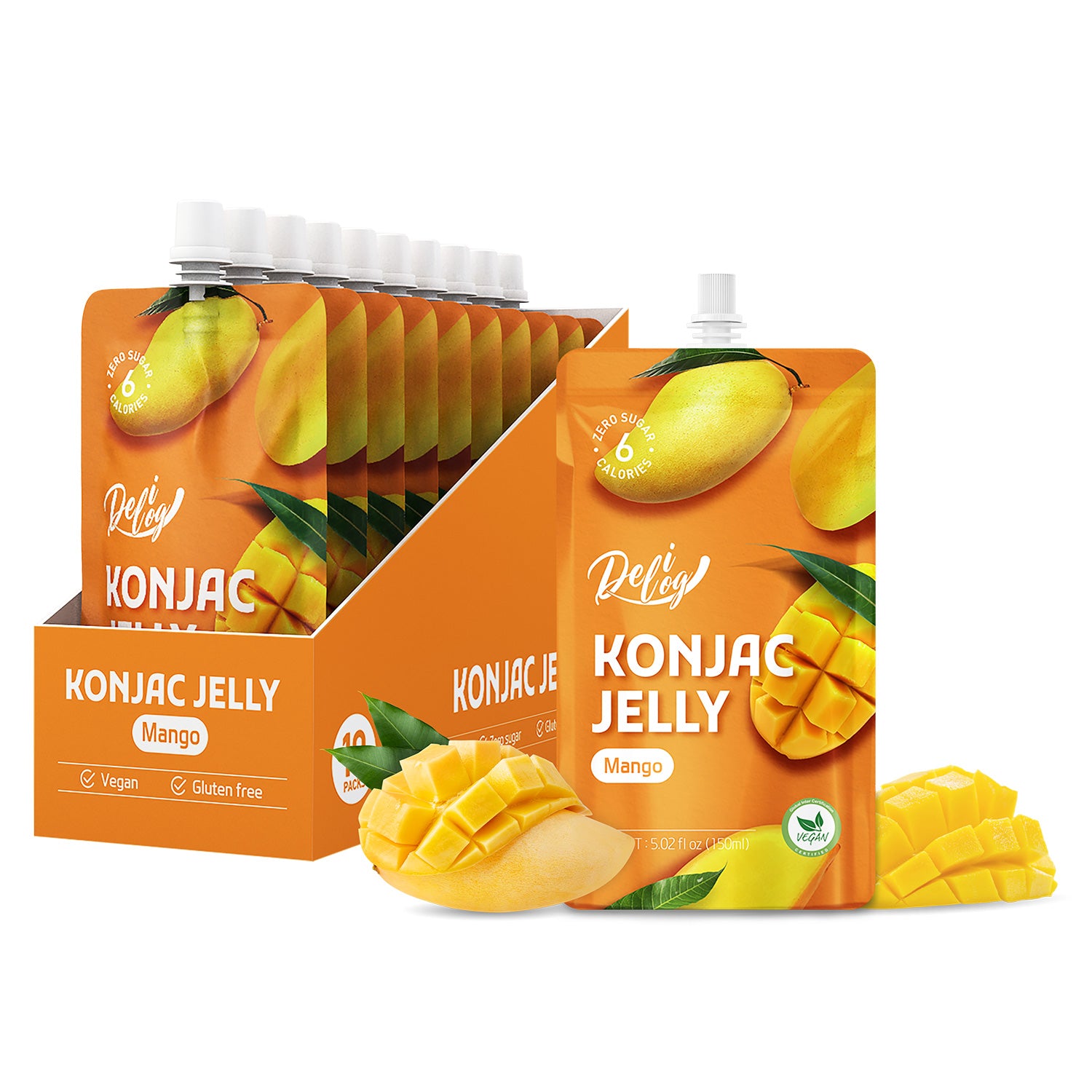 There are 10 x 150ml individual spout pouches of Delilog Konjac Jelly (Mango) in each box.