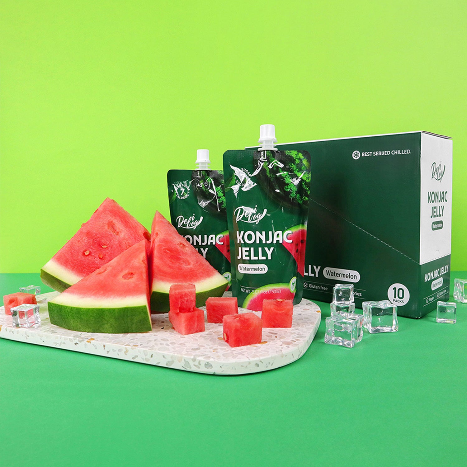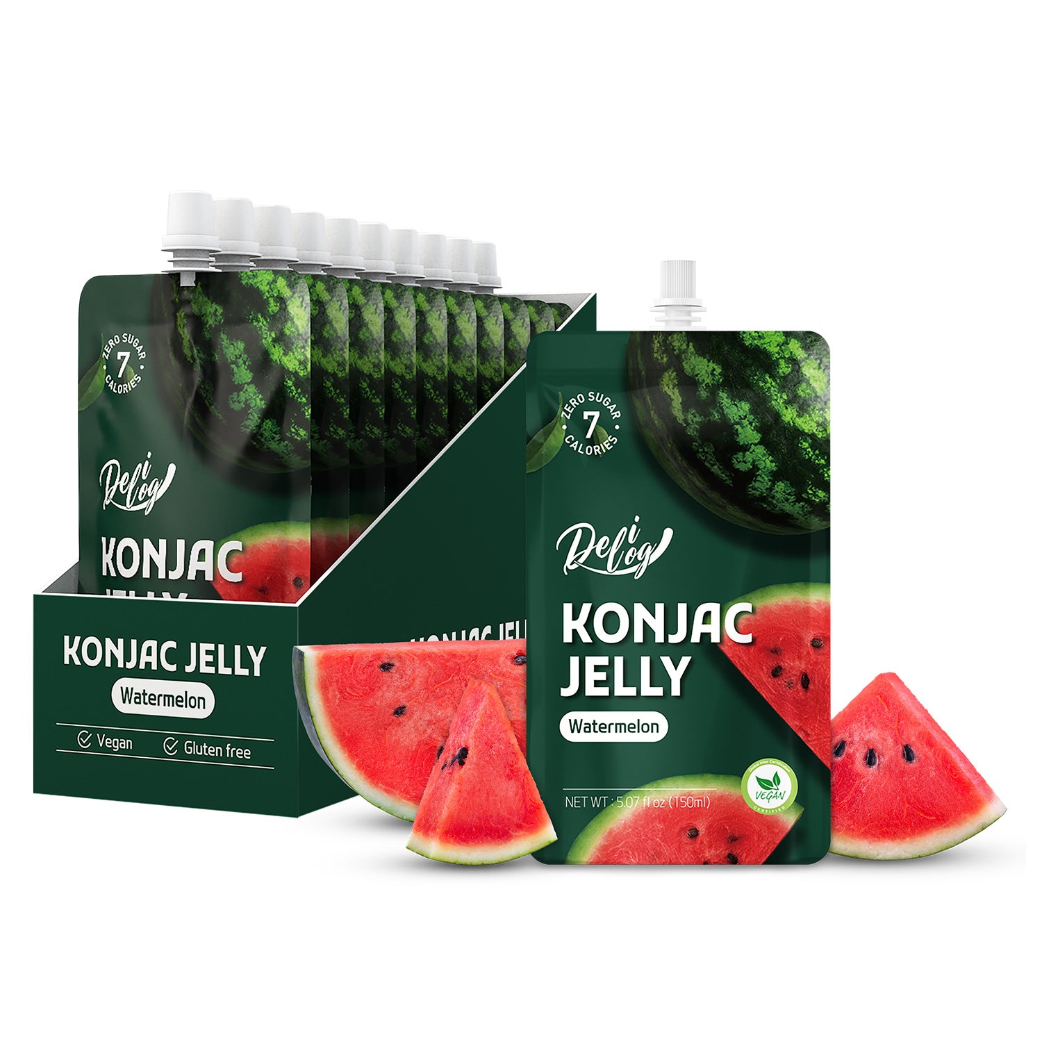 There are 10 x 150ml individual spout pouches of Delilog Konjac Jelly (Watermelon) in each box.